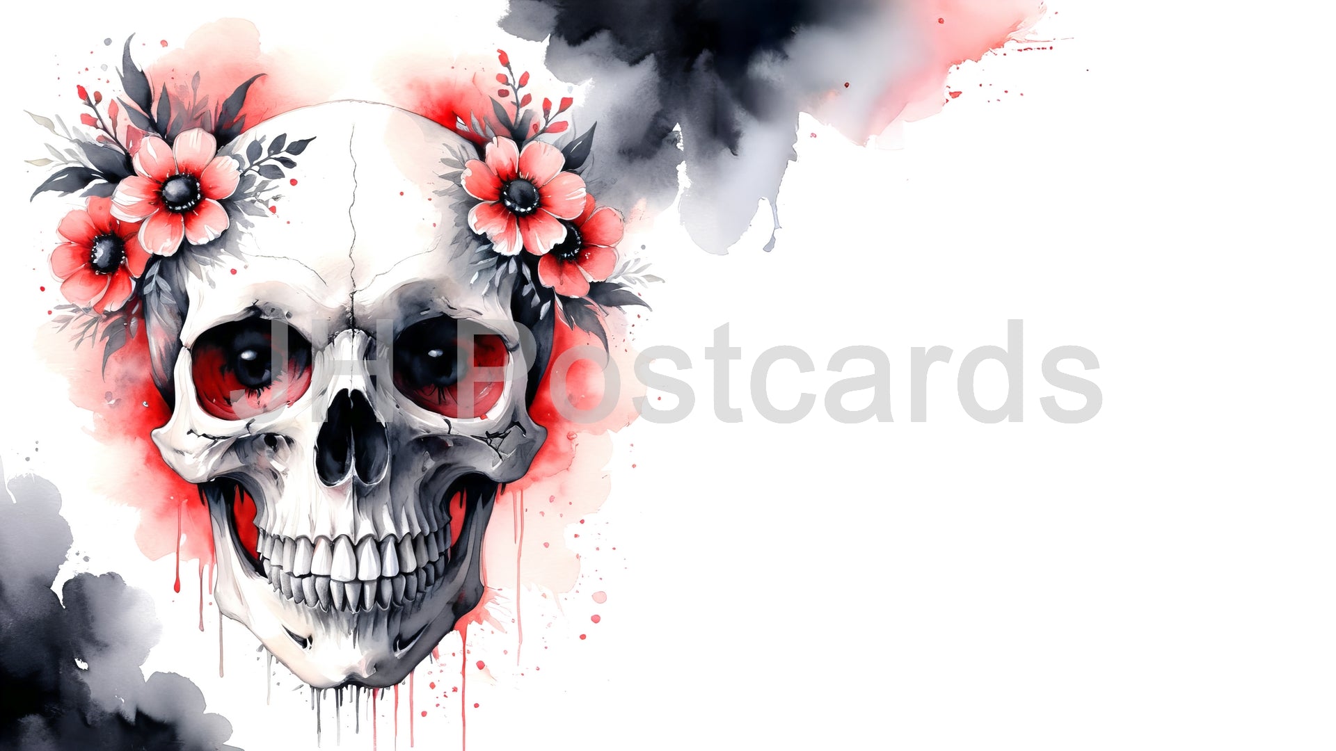 AI Image - Floral Skull: A striking watercolor painting of a human skull adorned with vibrant red roses. Halloween. Drawing. Art. Illustration. Copy Space. 1