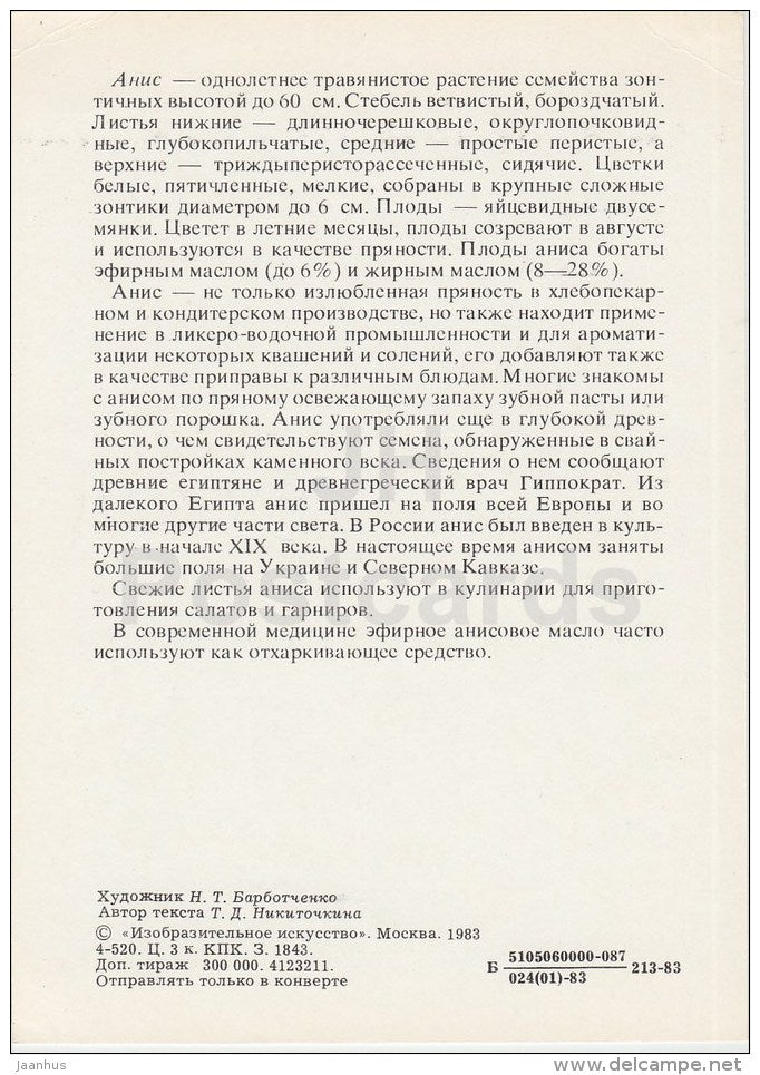 Anise - camel - Spice Plants - 1983 - Russia USSR - unused