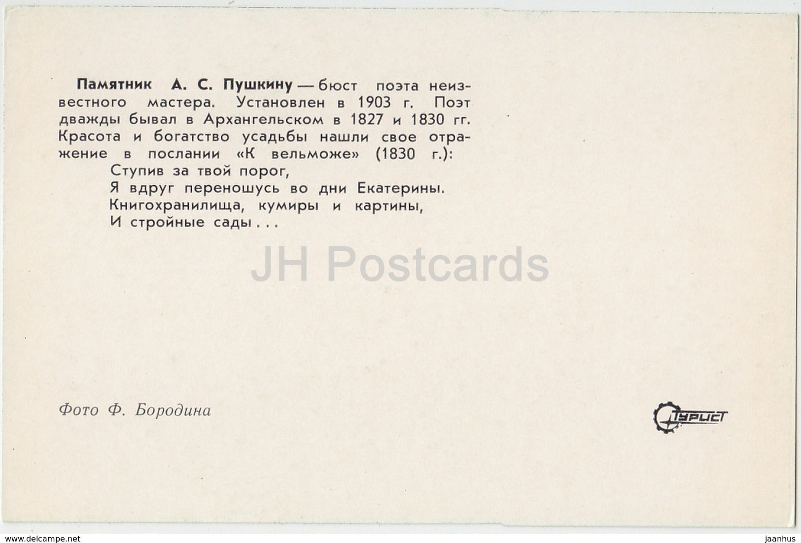 Arkhangelskoye Palace - monument to Pushkin - Turist - 1976 - Russia USSR - unused