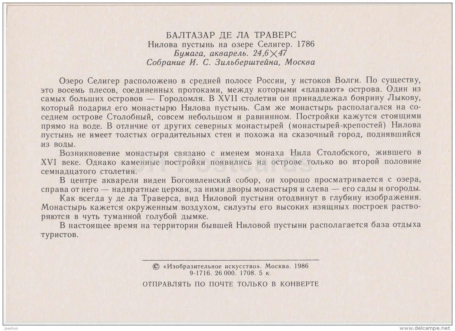 art by Balthazar de la Traverse - Nilov hermitage on the lake Seliger , 1786 - 1986 - Russia USSR - unused