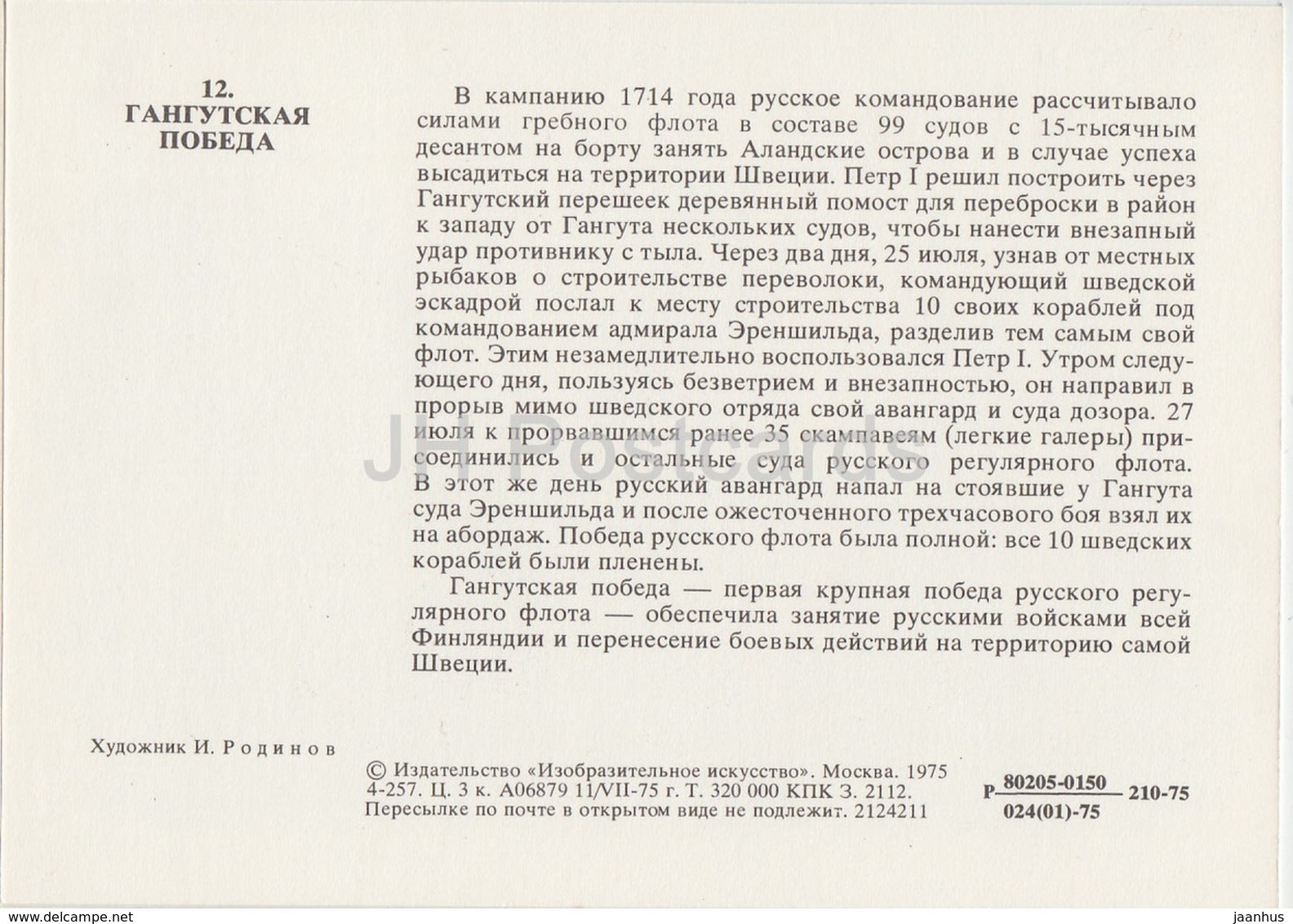 Battle of Gangut , 1714 - warship - sailing ship - History of Russian Navy - 1975 - Russia USSR - unused