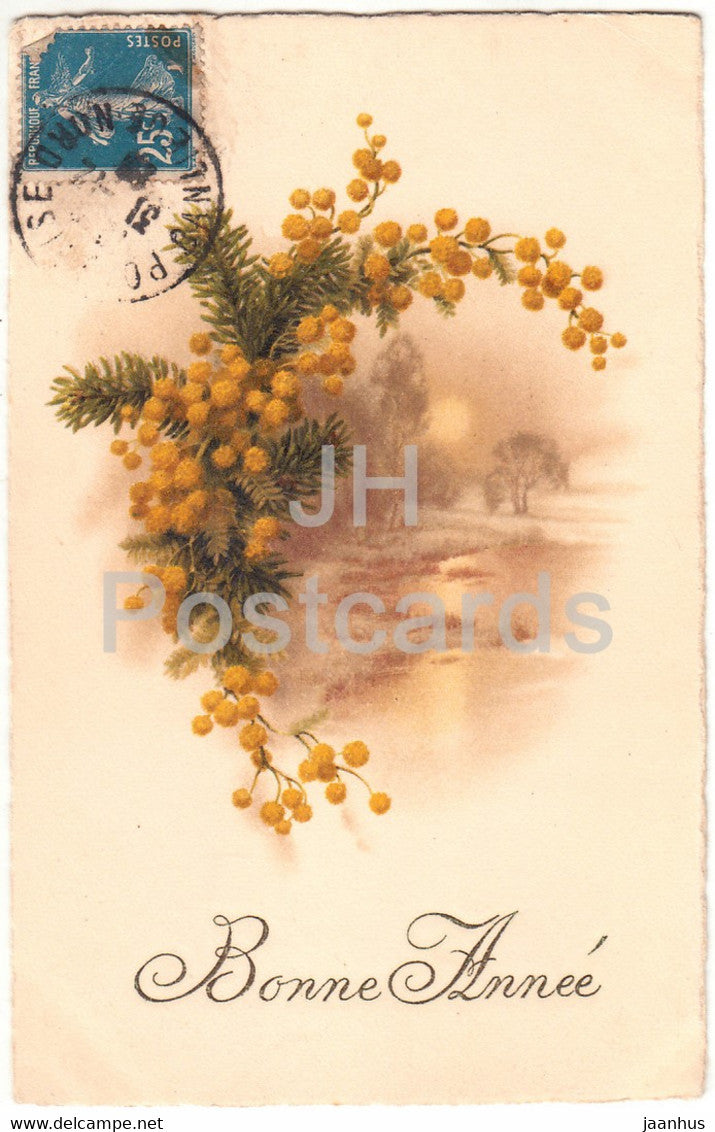 Birthday Greeting Card - Bonne annee - yellow flowers - illustration - old postcard - France - used