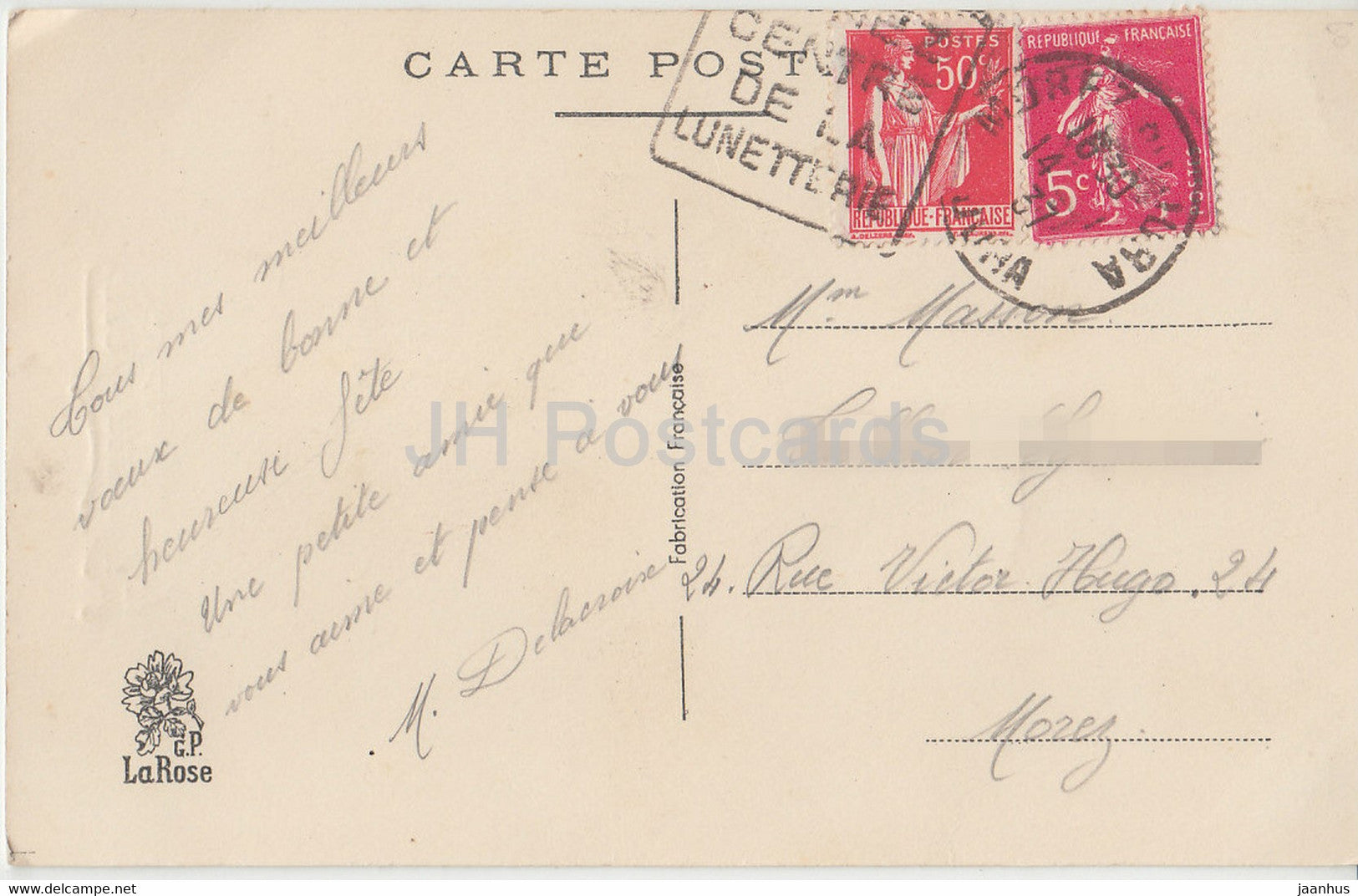 Birthday Greeting Card - Bonne Fete - flowers in a basket - La Rose - illustration - old postcard - 1937 - France - used