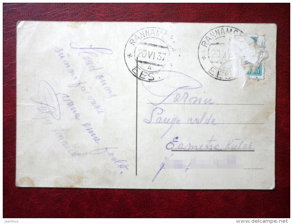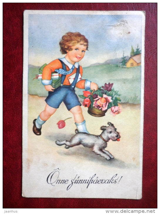 Birthday Greeting Card - boy - dog - flowers - circulated in 1937 - Estonia - used