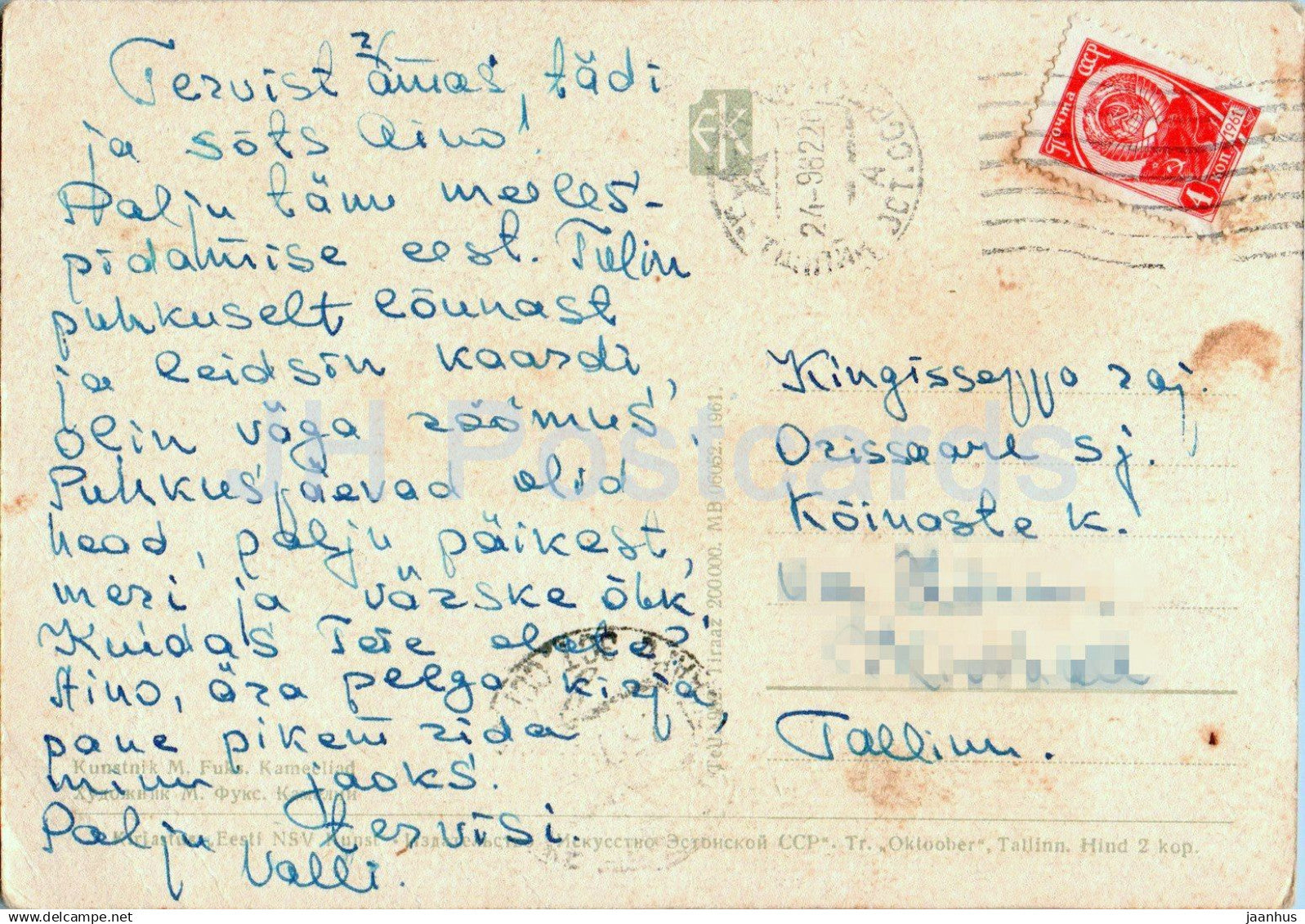 Birthday Greeting Card by M. Fuks - Camellia - red flowers - illustration - 1- 1961 - Estonia USSR - used