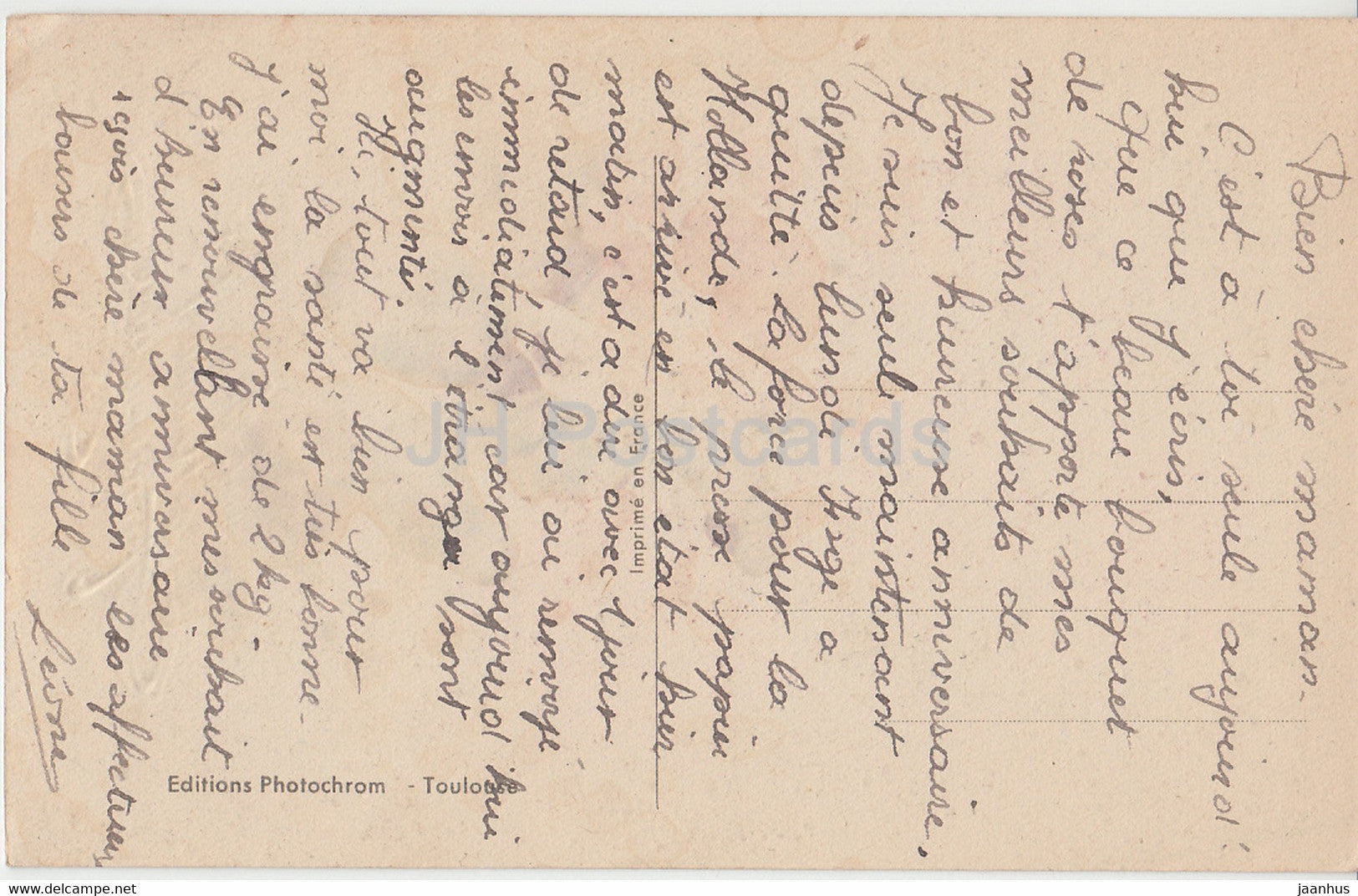 Birthday Greeting Card - Heureux Anniversaire - flowers in a vase - illustration - old postcard - France - used