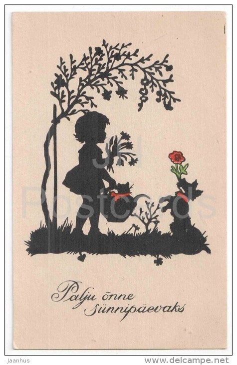 Birthday Greeting Card - Silhouette - flowers - girl - dog - old postcard - unused