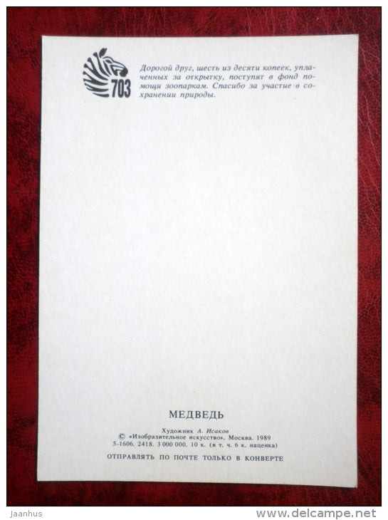 Brown bear by A. Isakov - Ursus arctos - animals - 1989 - Russia - USSR - unused