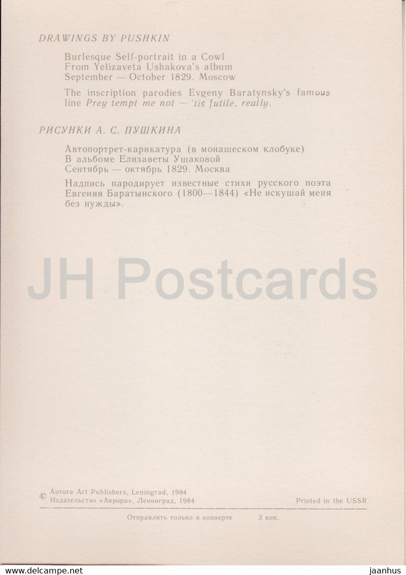 Burlesque Self Portrait in a Cowl - Drawings by Russian Poet Pushkin - 1984 - Russia USSR - unused