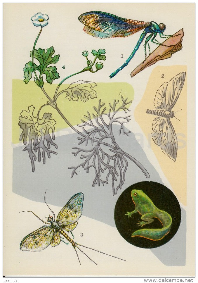 Calopterygidae , dragonfly - Acentria , moth - Mayfly - Buttercup - Life in Water - 1977 - Russia USSR - unused