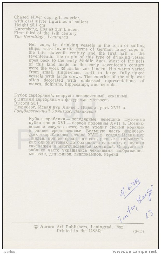 Chased Silver Cup , Gilt Exterior , Nuremberg - Western European Silver from Hermitage - 1982 - Russia USSR - unused
