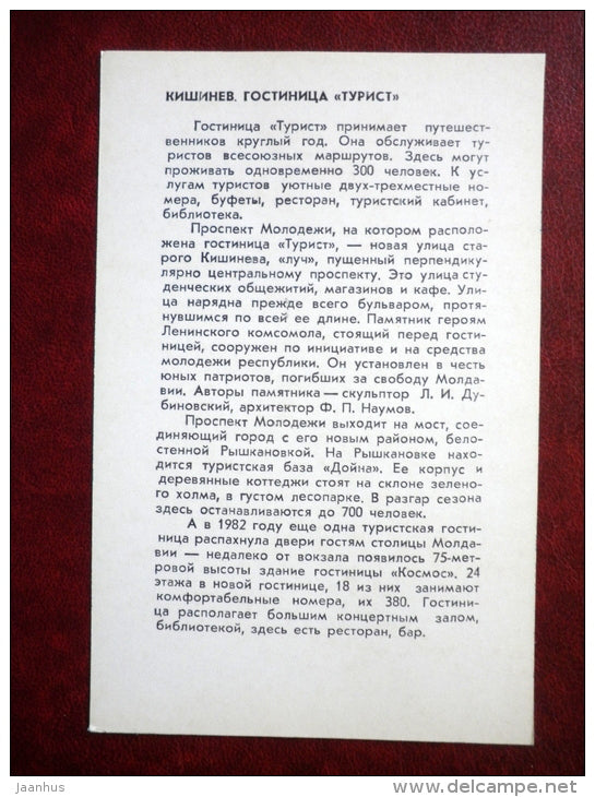 Chisinau - Kishinev - hotel Tourist - monument - 1985 - Moldova USSR - unused