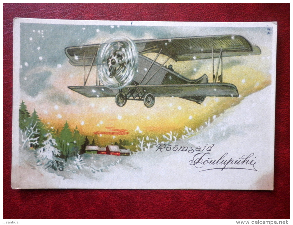 Christmas Greeting Card - airplane - houses - winter - circulated in 1947 - Estonia - used
