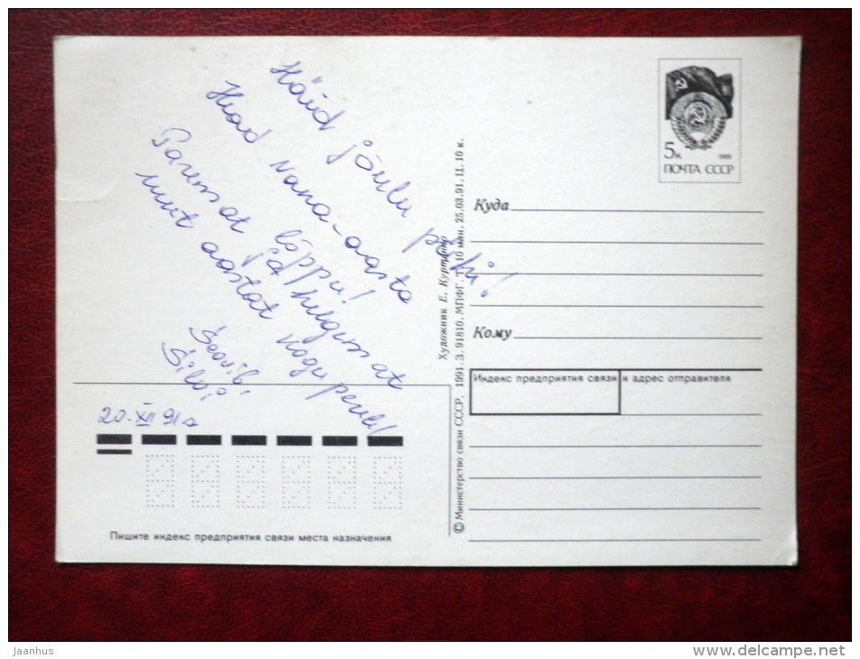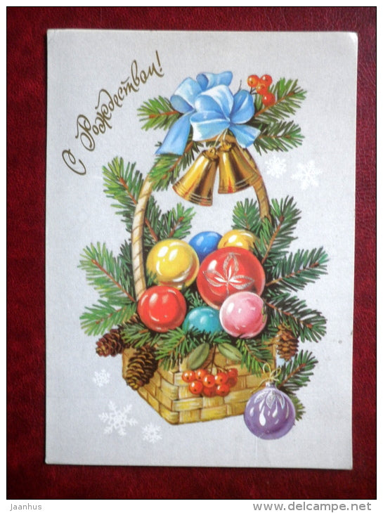 Christmas Greeting Card - by E. Kurtenko - decorations - basket - cones - 1991 - Russia USSR - used