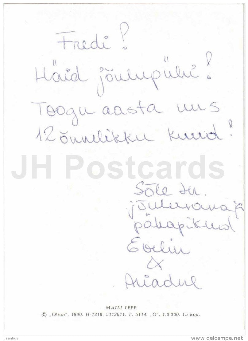 Christmas Greeting Card by Maili Lepp - gnomes - winter house - illustration - 1990 - Estonia USSR - used