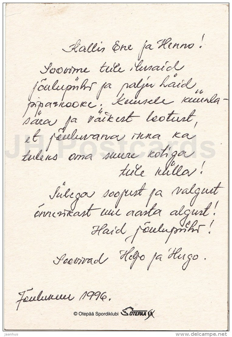 Christmas Greeting card by R. Johanson - birds - bullfinch - church - 1990s - Estonia - used