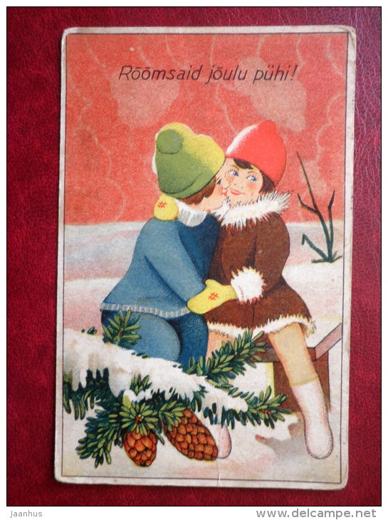 Christmas Greeting Card - girl and boy - circulated in 1932 - Estonia - used