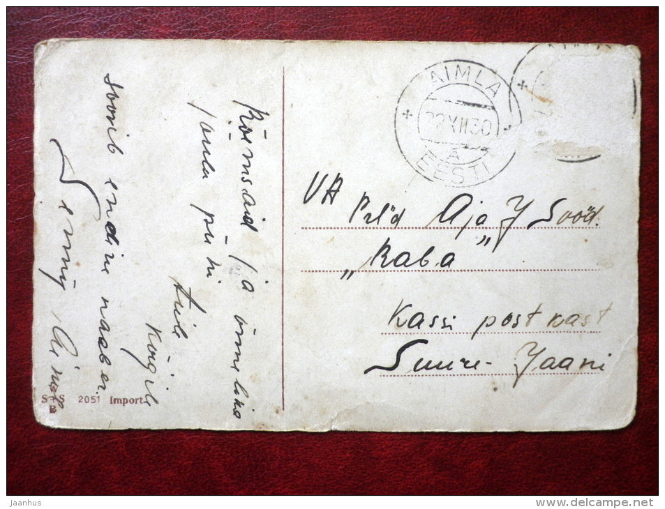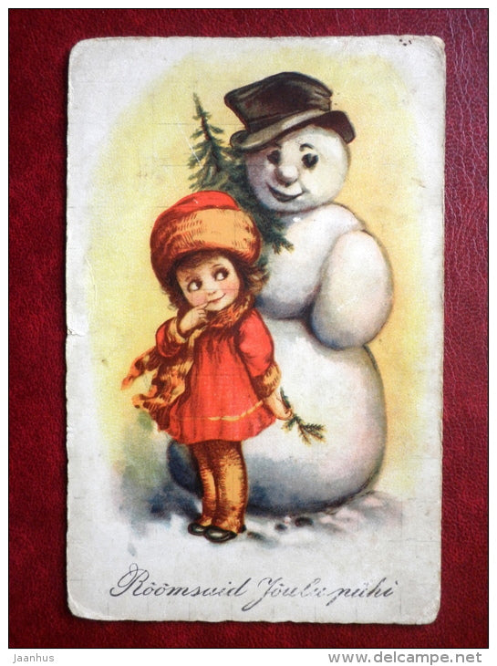 Christmas Greeting Card - snowman - little girl - WSSB 2051 - circulated in 1930 - Estonia - used