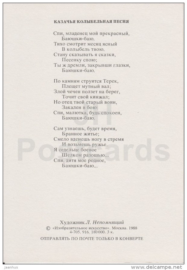 Cossack lullaby song - Russian poet M. Lermontov poetry by L. Nepomnyashchiy - Russia USSR - 1988 - unused