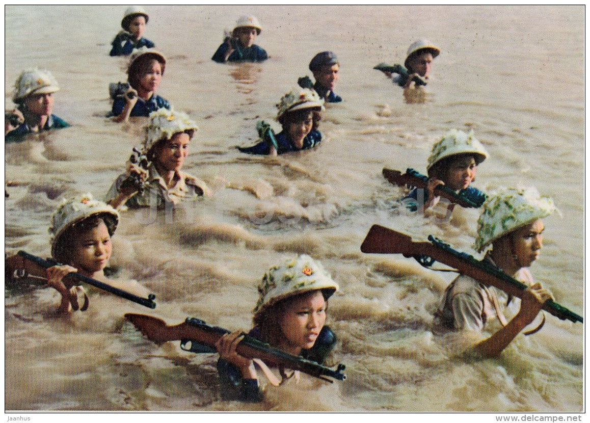 crossing the river Hong - women soldiers - Hanoi - old postcard - Vietnam - unused