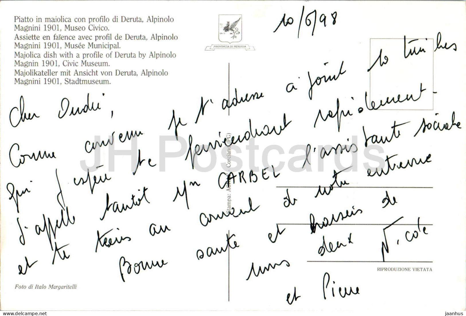 Deruta - Majolica Dish with a profile of Deruta by Alpinolo Magnin - 1998 - Italy - used