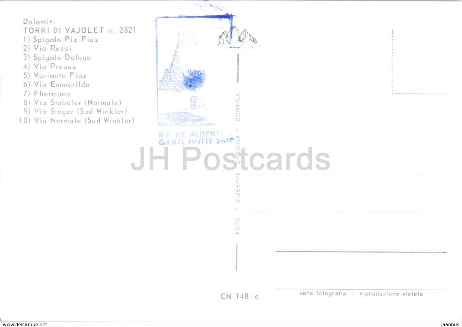 Dolomiti - Torri di Vajolet - Spigolo Piz Piaz - Via Rossi - Spigolo Delago - Via Preuss - old postcard - Italy - unused