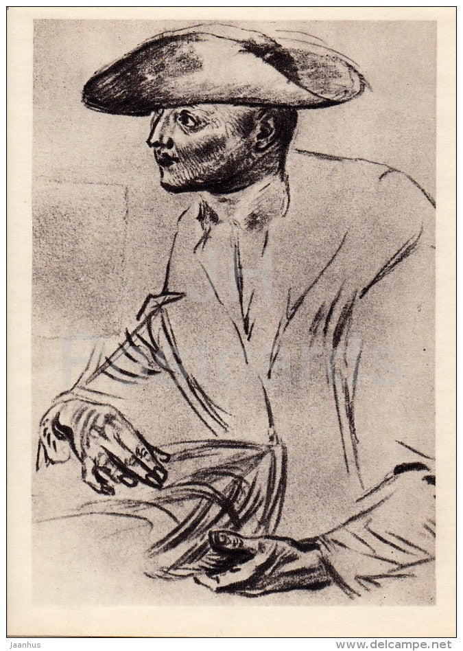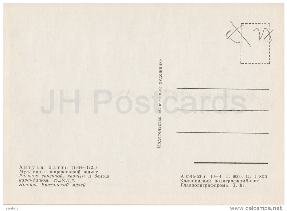 drawing by Jean-Antoine Watteau - A man in a wide-brimmed hat - French art - 1963 - Russia USSR - unused