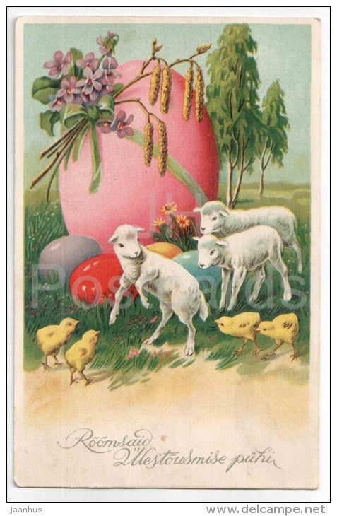 Easter Greeting Card - eggs - chicken - lamb - sheep - flowers - circulated in Estonia 1940
