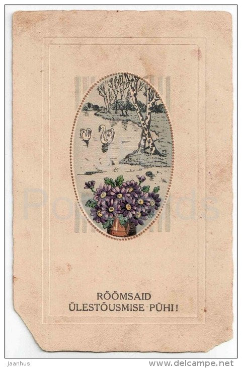 Easter Greeting Card - swan - flowers - birch trees - circulated in Estonia Tallinn 1923