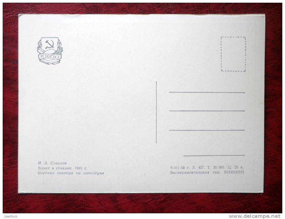 Engraving by I. Sokolov - bouquet in a glass, 1945 - flowers - russian art - unused