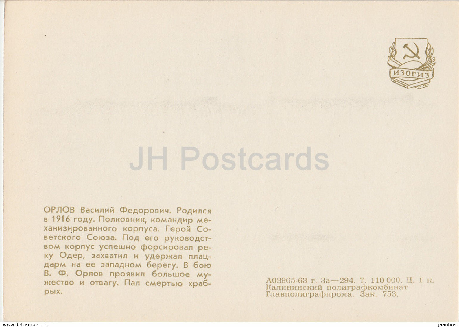 F. Orlov - Soviet Heroes of WWII - tank - illustration by L. Kotlyarov - 1963 - Russia USSR - unused