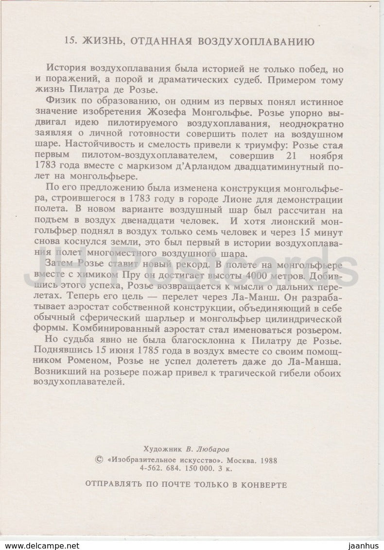 First Balloon Crash of de Rozier - Aviation History - illustration by V. Lyubarov - 1988 - Russia USSR - unused