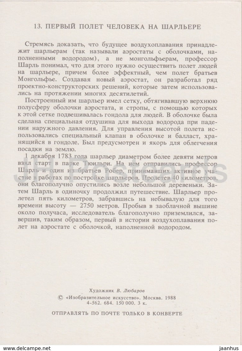 First Free Flight on Balloon of brothers - Aviation History - illustration by V. Lyubarov - 1988 - Russia USSR - unused