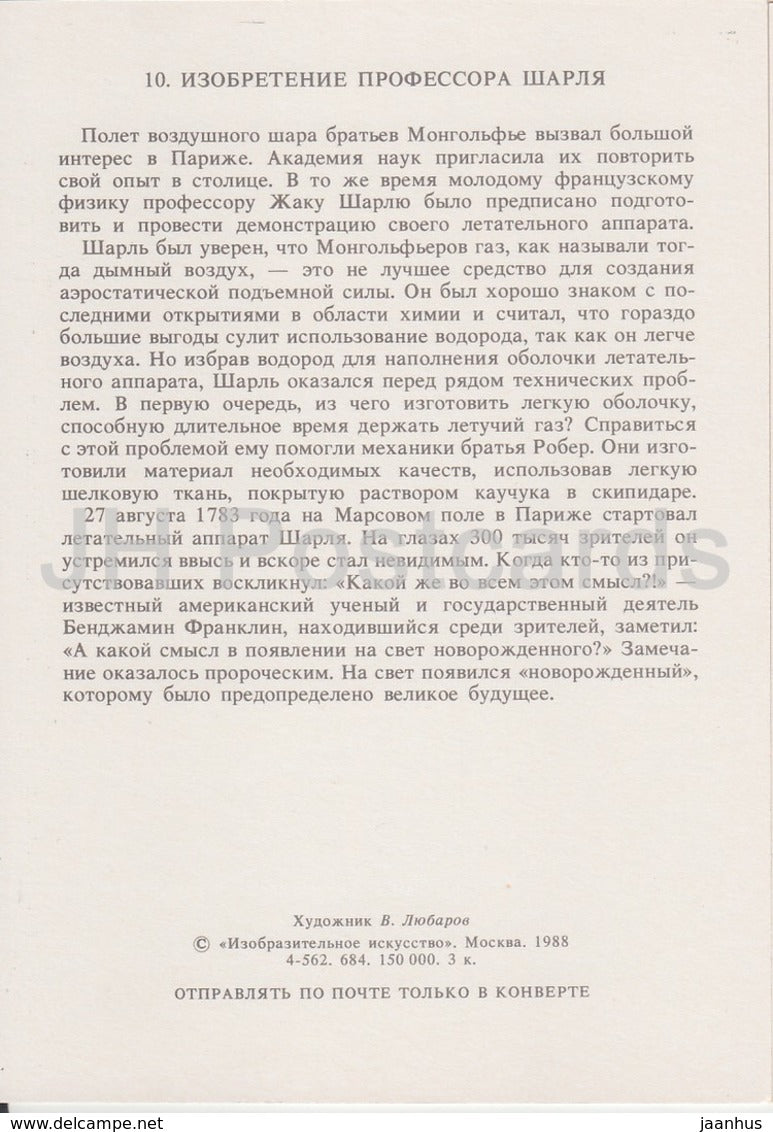 First Hydrogen Balloon by Charles - Aviation History - illustration by V. Lyubarov - 1988 - Russia USSR - unused