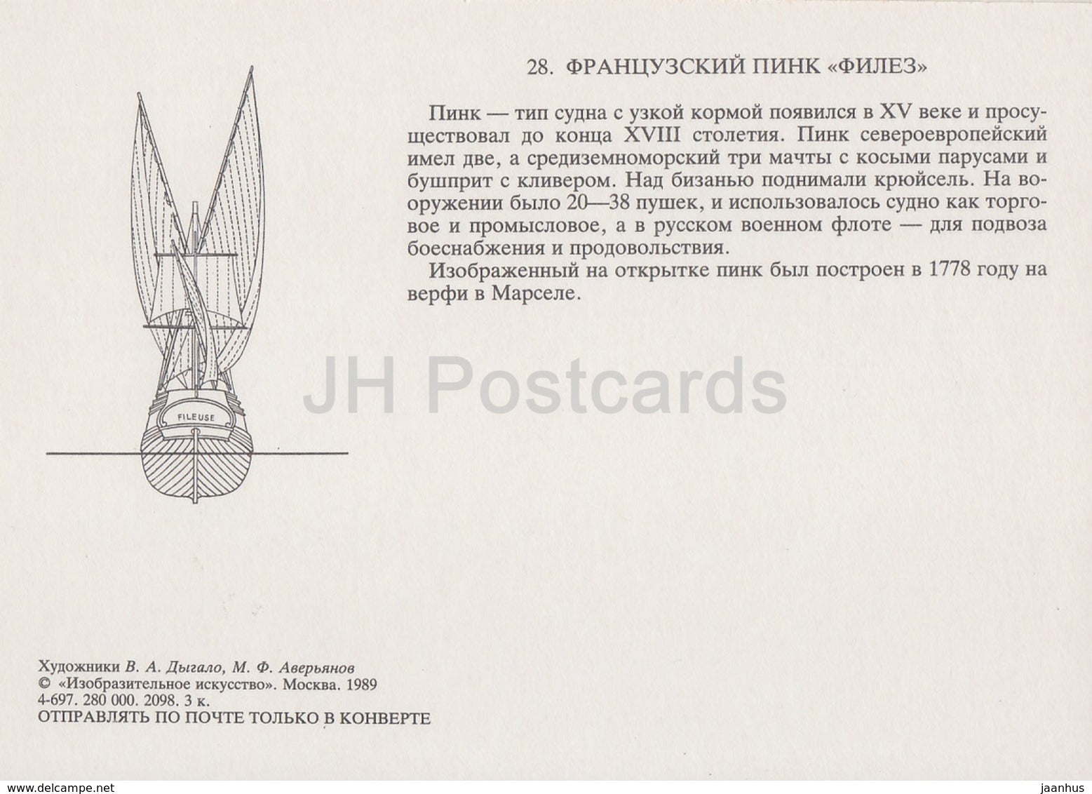 French Pink Filez - sailing ship - illustration - 1989 - Russia USSR - unused