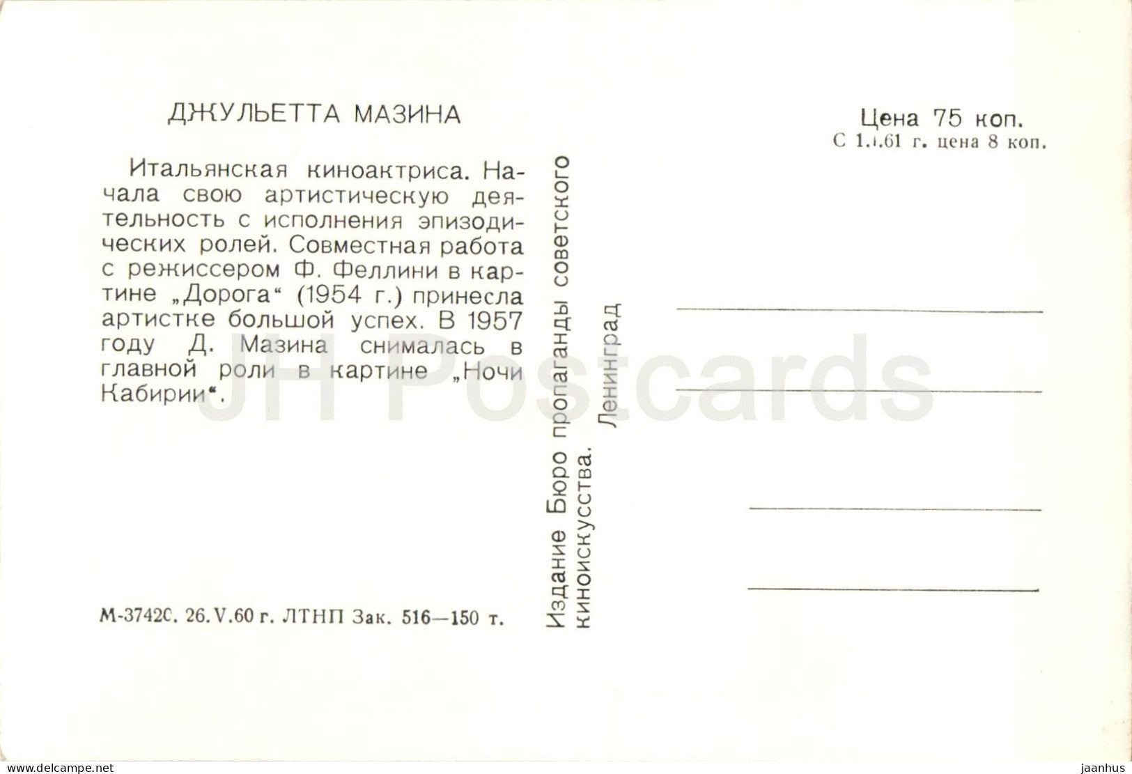Giulietta Masina - Italian movie actress - 1960 - Russia USSR - unused