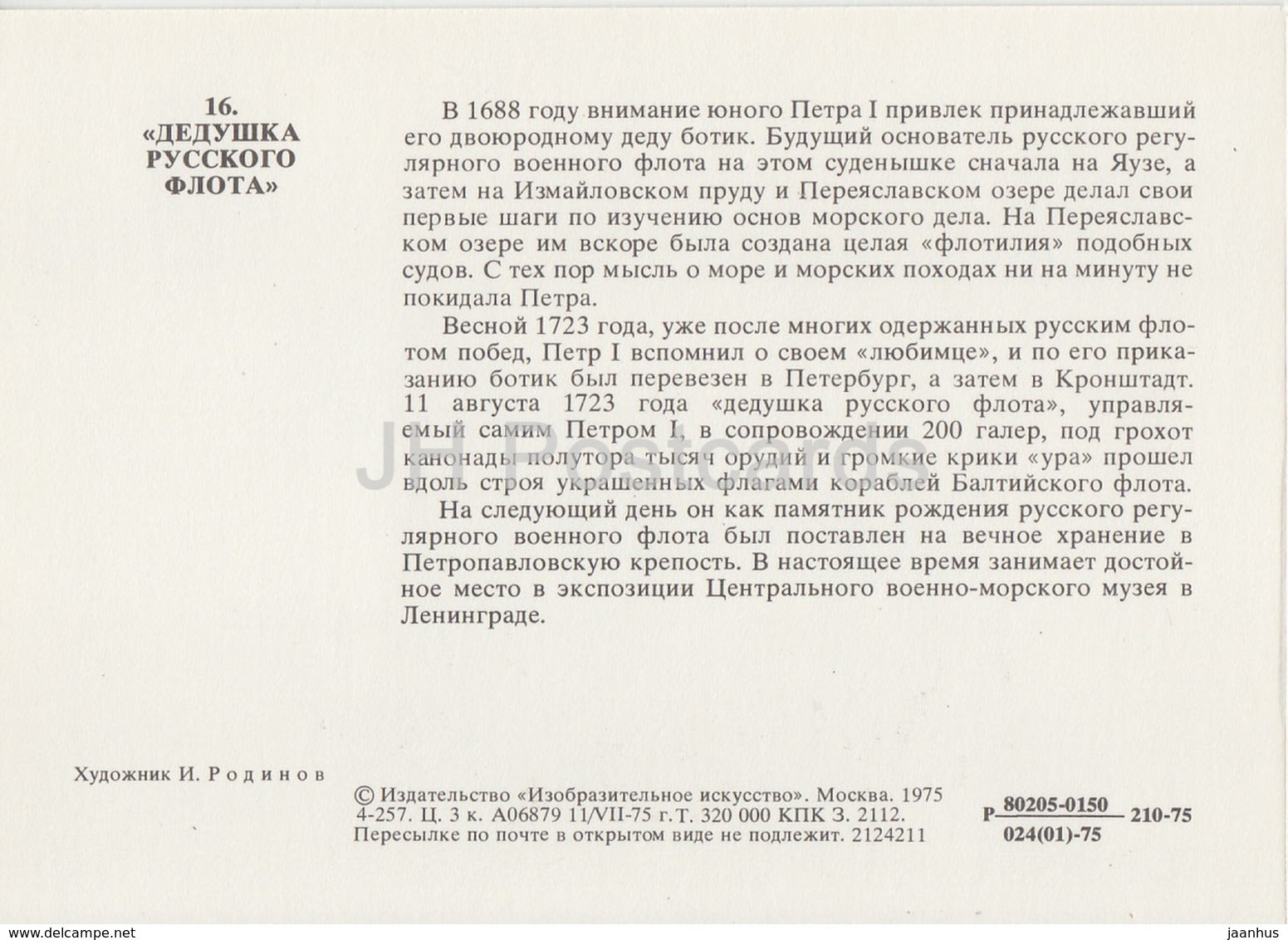 grandfather of the Russian fleet - boat of Peter I - History of Russian Navy - 1975 - Russia USSR - unused