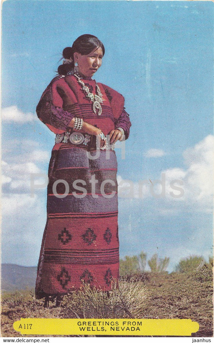 Greetings from Wells - Nevada - woman in folk costume - old postcard - 1953 - USA - used