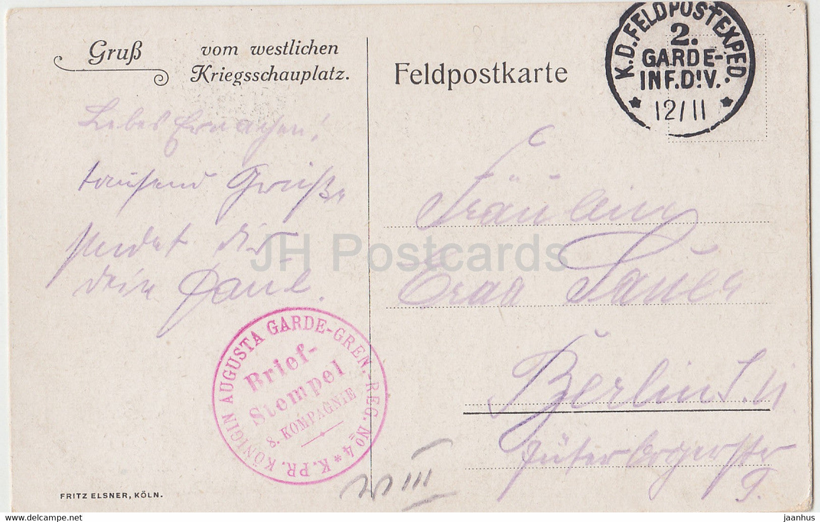 Gruss vom westlichen Kriegsschauplatz - Konigin Augusta Garde Gren Feldpostkarte - old postcard - France - used