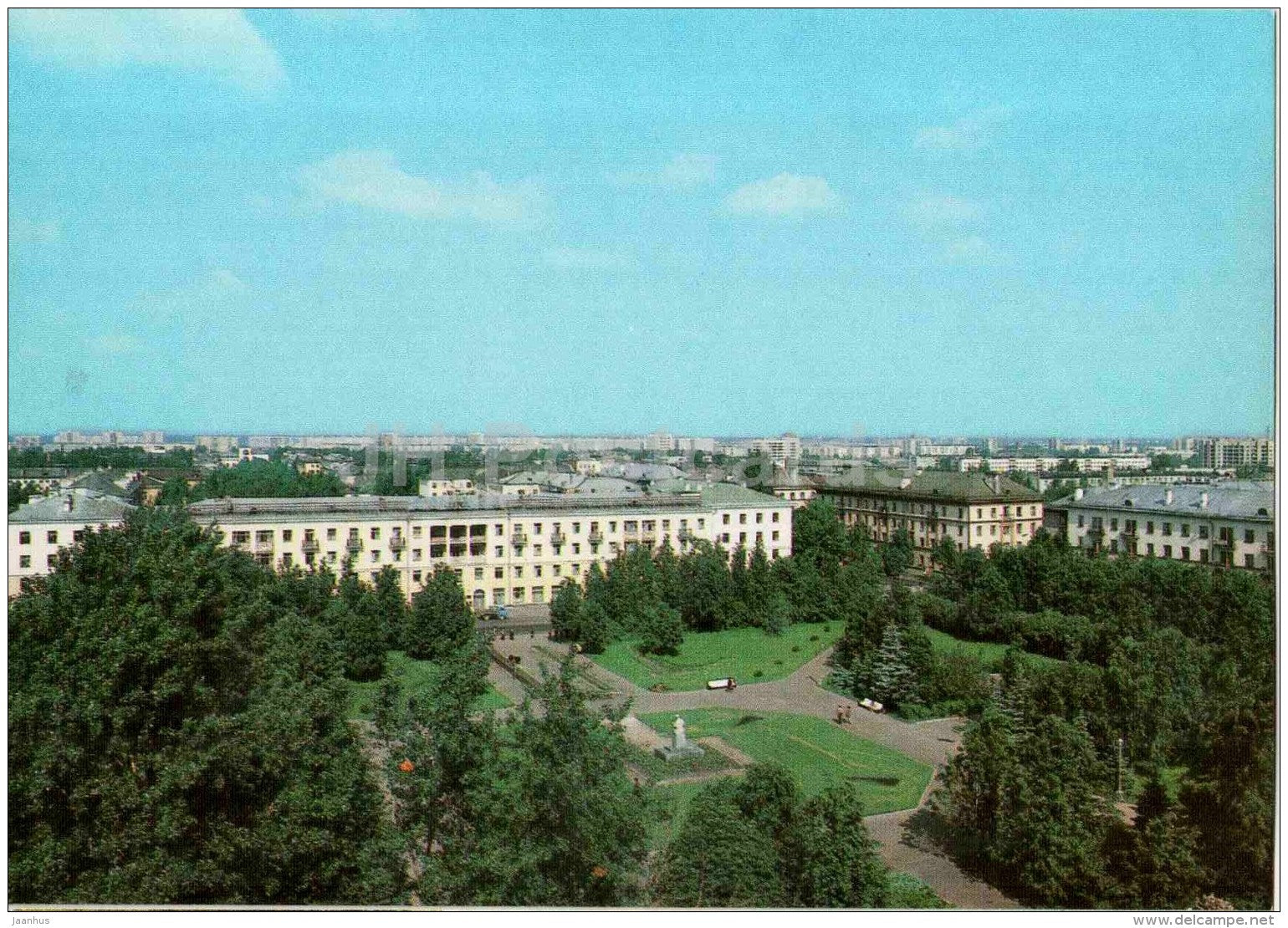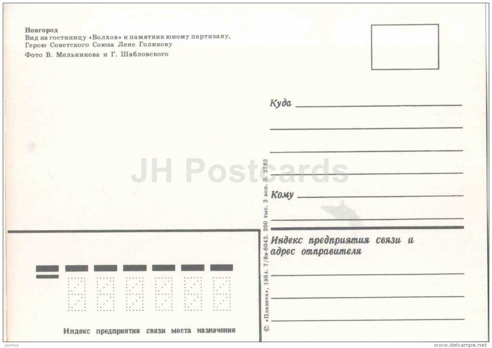 hotel Volkhov and monument to partisan Lyona Gulikov - Novgorod - 1984 - Russia USSR - unused