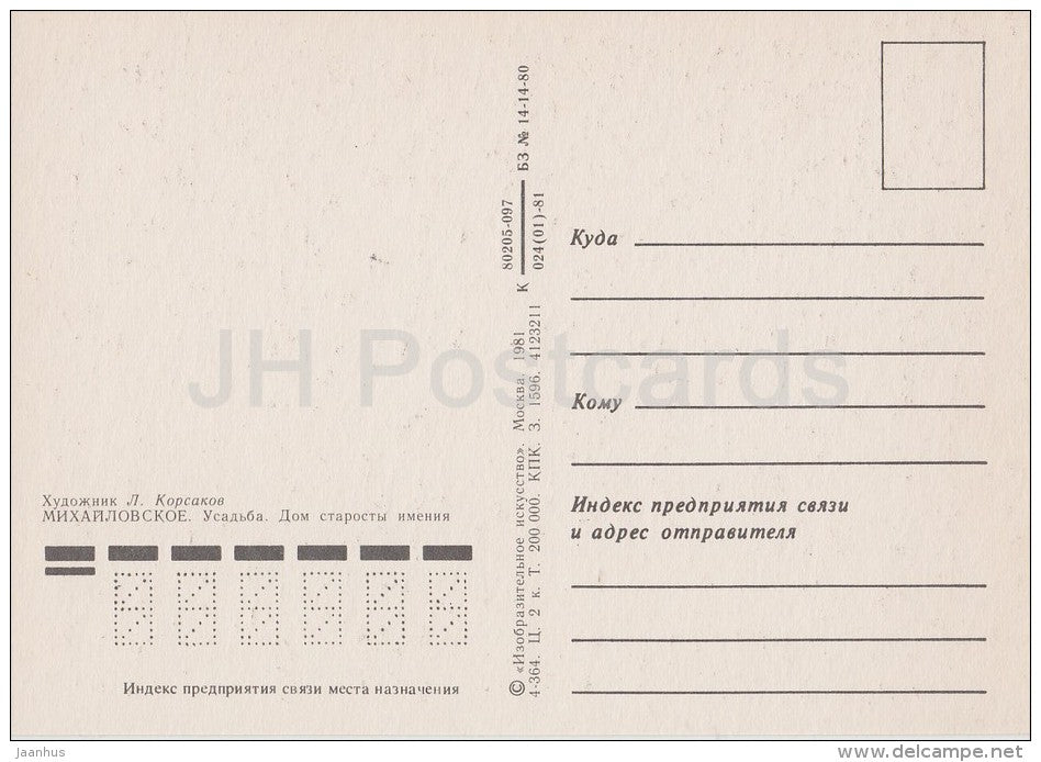 House of the head of the estate - Mikhaylovskoye - illustration by L. Korsakov - Russia USSR - 1981 - unused