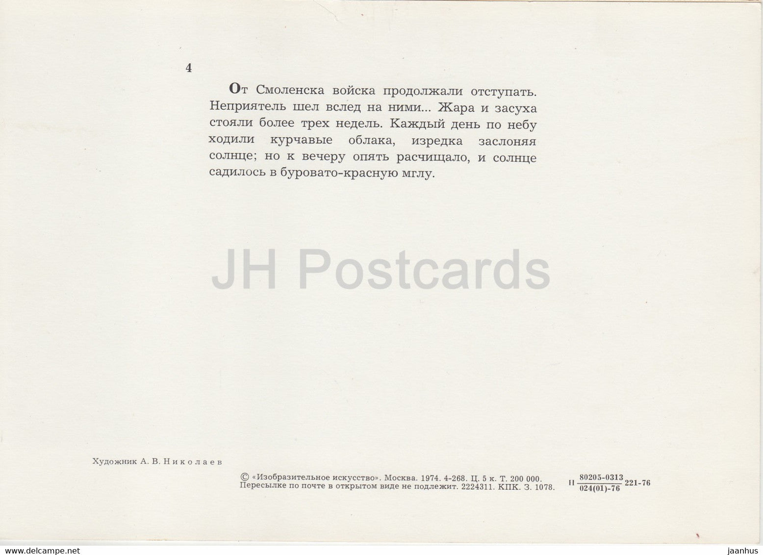 illustration by A. Nikolayev - war - War and Peace by L. Tolstoy - large format card 1974 - Russia USSR - unused