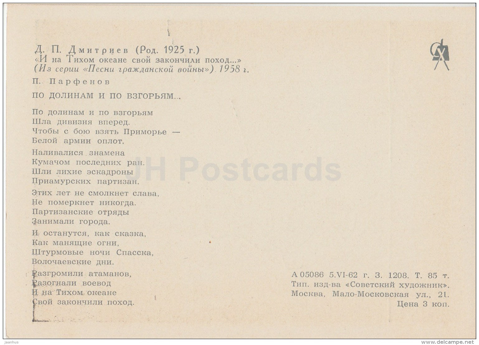 illustration by D. Dmitriyev - soldier - Red Army - Songs of Civil War - 1962 - Russia USSR - unused