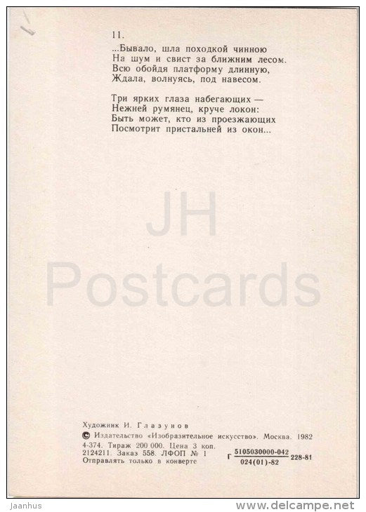 illustration by I. Glazunov - On the railroad by russian poet Aleksandr Blok - train - 1982 - Russia USSR - unused