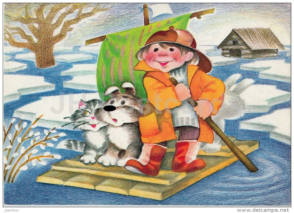 illustration by U. Meister - boy - dog - cat - raft - 1990 - Estonia USSR - unused