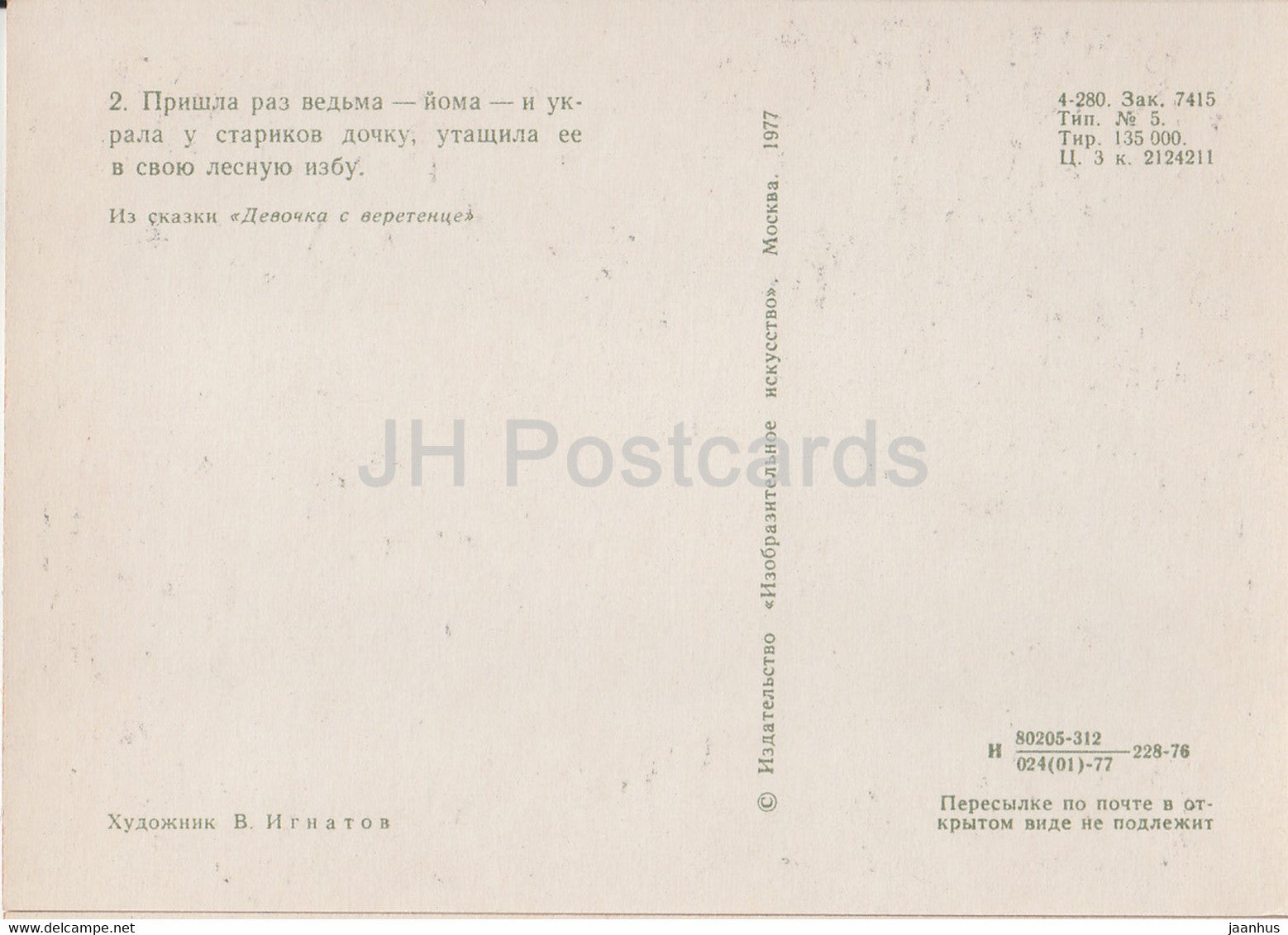 illustration by V. Ignatov - Girl with a spindle - flying witch - Komi fairy tale - 1977 - Russia USSR - unused