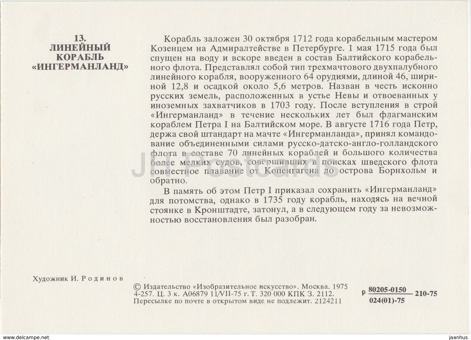 Ingermanland - warship - sailing ship - History of Russian Navy - 1975 - Russia USSR - unused