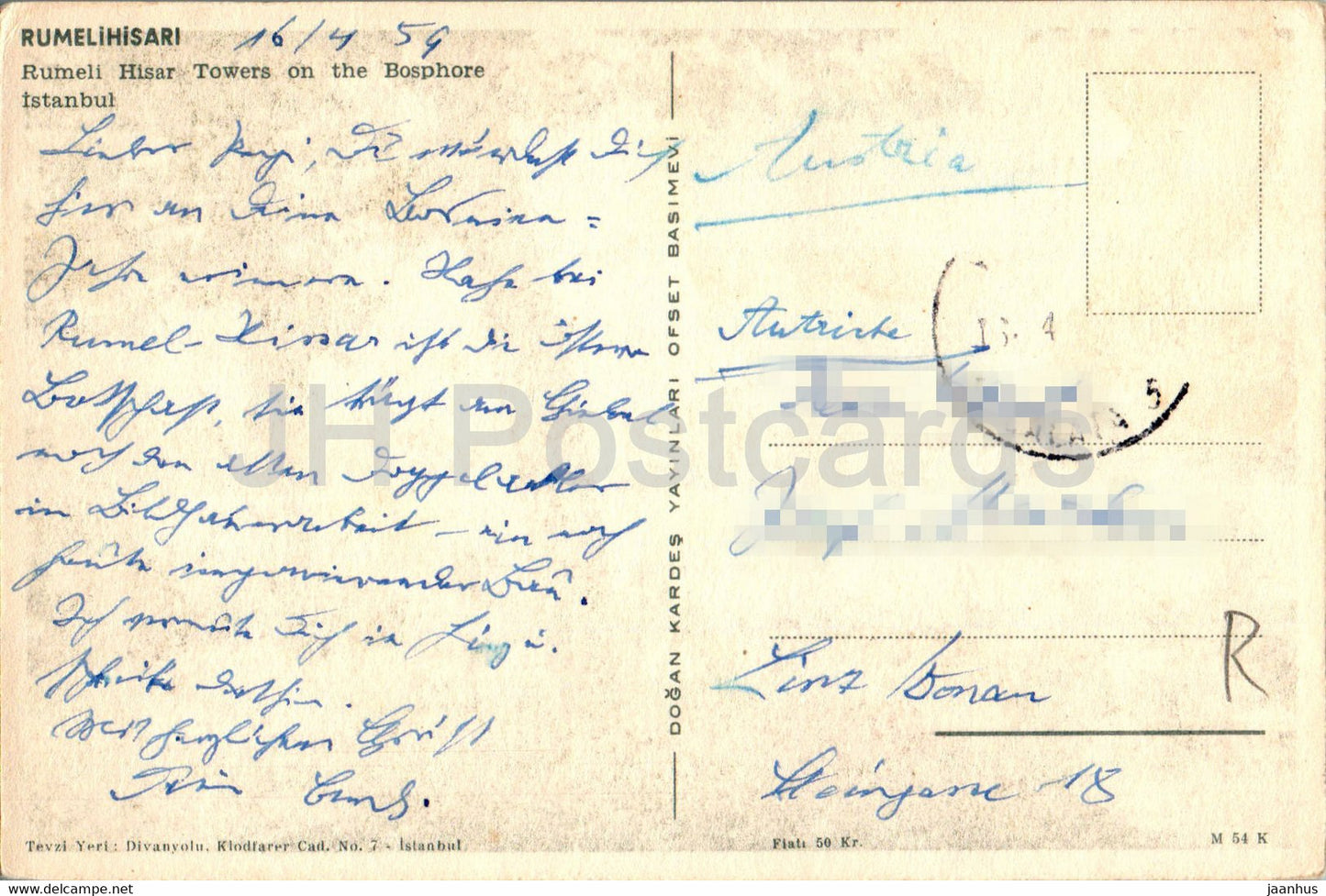 Istanbul - Rumeli Hisar Towers on the Bosphore - old postcard - 1959 - Turkey - used