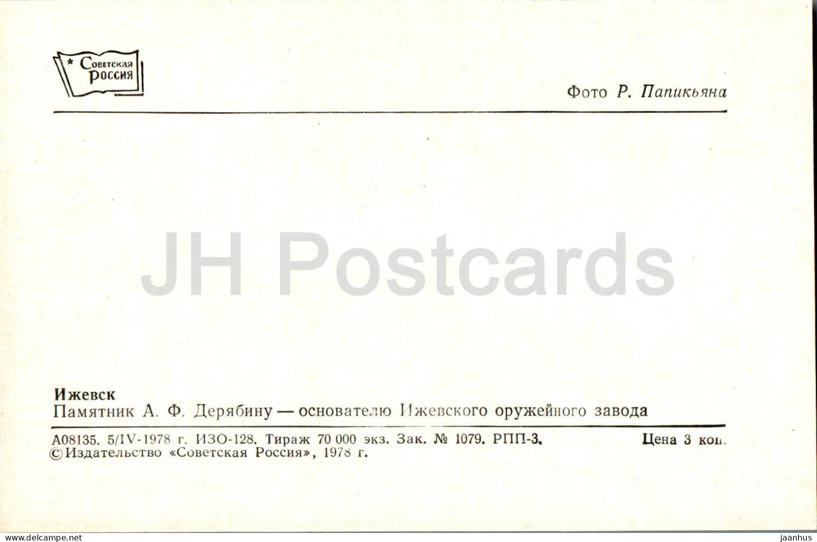 Izhevsk - monument to Deryabin , founder of the Izhevsk arms factory - 1978 - Udmurtia - Russia USSR - unused