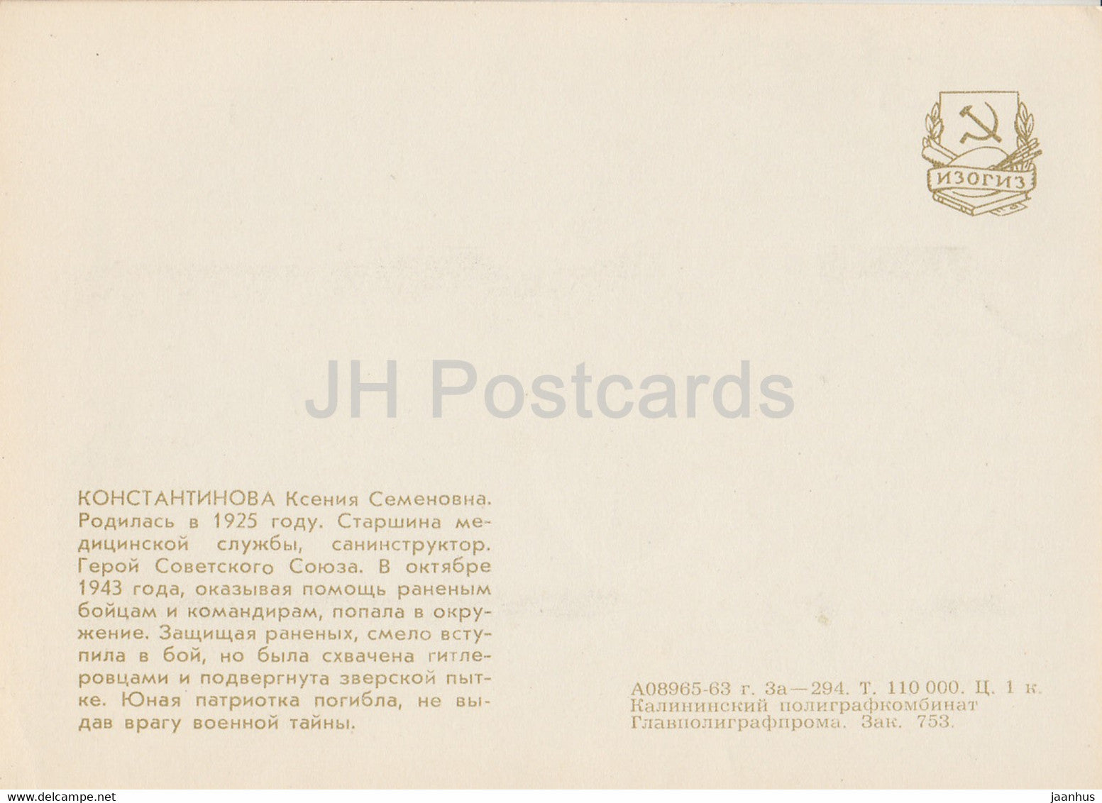 K. Konstantinova - Soviet Heroes of WWII - illustration by L. Kotlyarov - 1963 - Russia USSR - unused